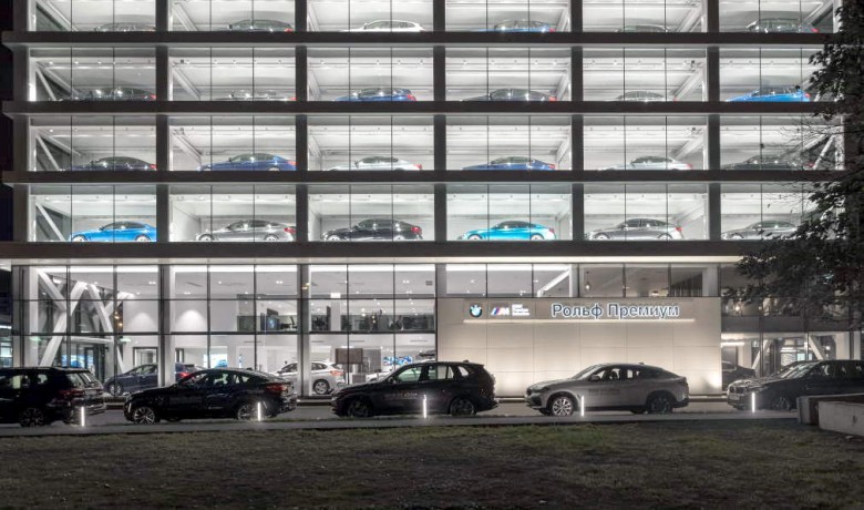 Общая площадь дилерского центра «BMW РОЛЬФ Премиум Химки» составляет 15 755 кв.м. Это третий автоцентр BMW, открытый РОЛЬФом, и первый, который выполнен по новым архитектурным стандартам. Фасад в виде витрины из 30 автомобилей BMW, расположенных в отдельных ячейках, - это, согласитесь, впечатляет. Особенно, если он (фасад) подсвечивается в темное время суток.